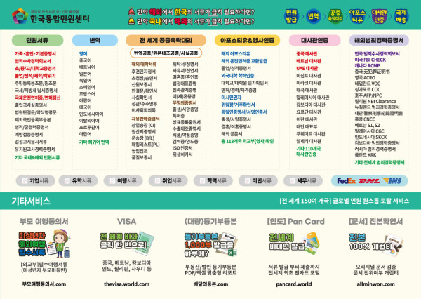 이 모든 과정을 직접 준비하기엔 정보나 시간이 부족하여 진행이 어려울 때가 종종 있습니다, 이럴 때 신속하고 정확하게 서류를 준비하실 수 있도록 한국통합민원센터에서 도와드리겠습니다! 한국통합민원센터에서는 국내외 민원서류에 대한 '발급-번역-공증촉탁대리-외교부(아포스티유, 영사확인)-대사관인증-해외배송'이라는 복잡하고 까다로운 과정을 온라인, 모바일로 손쉽게 신청하고 처리할 수 있도록 서비스를 제공하고 있습니다.