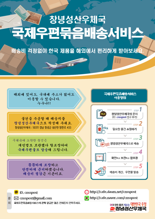 국제우편묶음배송서비스는 우체국에서 취급하고 국제우편(EMS 등)으로 발송하므로 안전하고 신속합니다. 우편물 발송과 관련해 국제우편요금과 우체국 소포상자 요금 이외 별도의 비용이 없어 경제적입니다. 경우에 따라 현지 세관 등의 통관 과정에서 관․부가세 등이 발생할 수도 있습니다. 물건의 도착, 겁수, 합포장, 접수와 발송의 전 과정을 카카오톡, SMS, 이메일 등으로 안내하므로 정확하고 믿을 수 있습니다. 국제우편묶음배송서비스에 대해 궁금하신 점이 있으시면 인터넷 카페(DAUM과 NAVER 카페에서 '창녕성산우체국' 을 검색하거나, 카카오톡(ID cnsspost / 카카오톡 채널-창녕성산우체국), 이메일(cnsspost@gmail.com), 모바일(+82 0506 944 5080)으로 연락주세요. 고맙습니다.